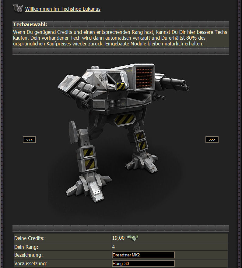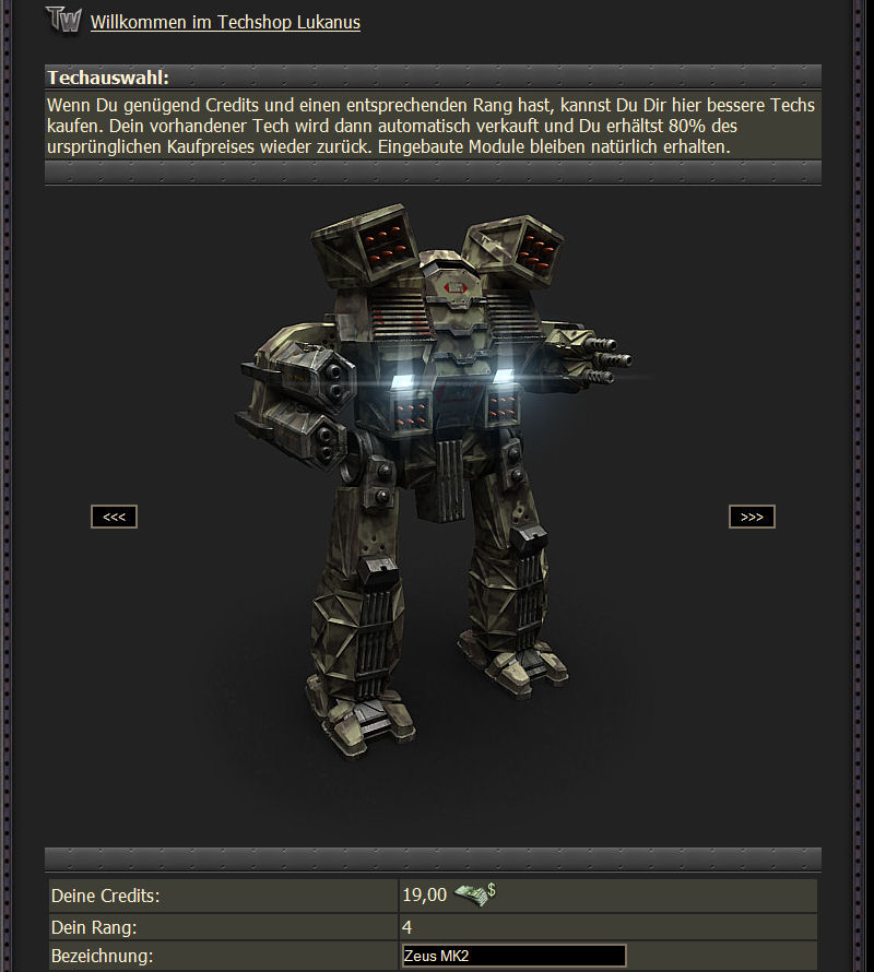 For example, you can send the link to your friends, place it on your homepage or use it as a signature in forums. If a prospective recruit clicks on your link, you receive 1-3 credits as a reward! If your visitor registers a TechWarrior account on the same server, you have recruited a new TechWarrior and you receive 25% of the credits that that the new recruit receives from his/her own victims in the internet! Once the character(s) you have created via your recruiting-link has reached level 3, you receive 50 Gold and 1 Experience Point! You can invest your Gold in training for your pilot or you can buy upgraded weapons, armour and modules for your tech.