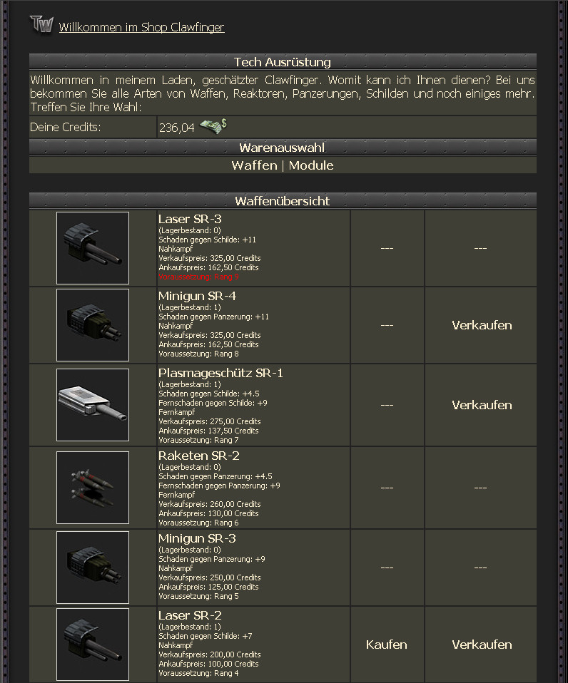 Here you can purchase new and better weapons and modules for your tech. The modules and weapons only increase the attributes of your tech after they have been installed. To install the new items, click on the Equip button under the image of your tech.